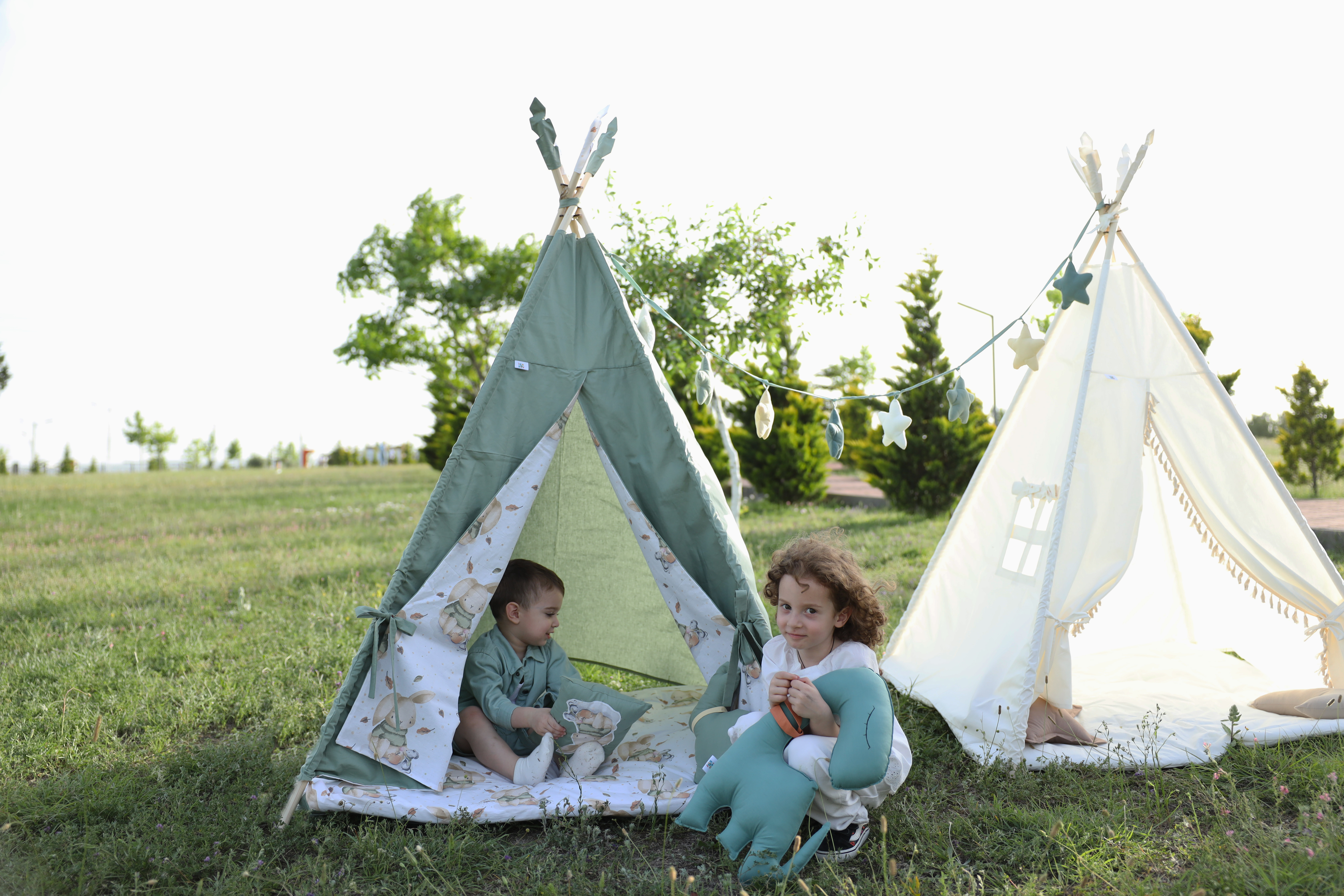 მუქი მწვანე კარავი მელიებიანი პრინტით და დინო ბალიშით